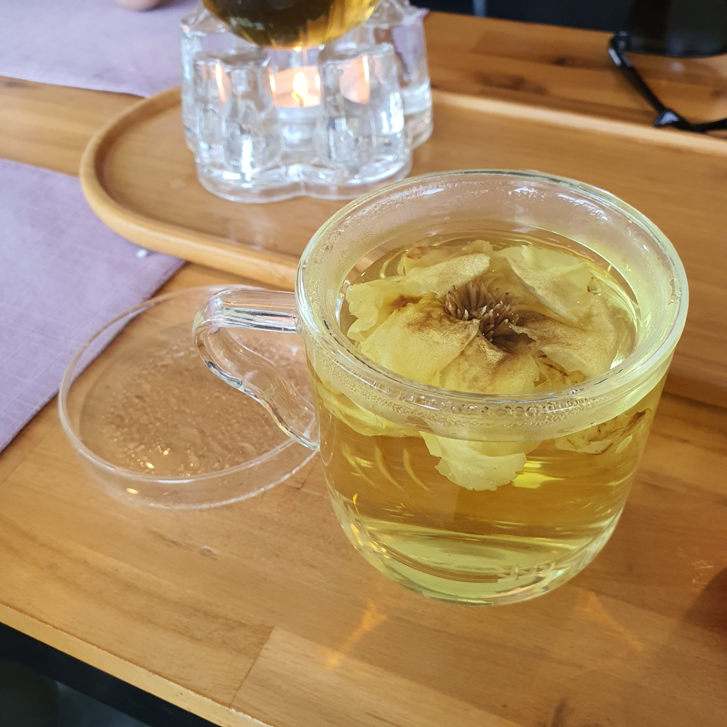 꽃차 체험 프로그램도 있고, 시음할 수 있는 꽃차도 카페 내에 해두어서 시음도 해보았어요.
