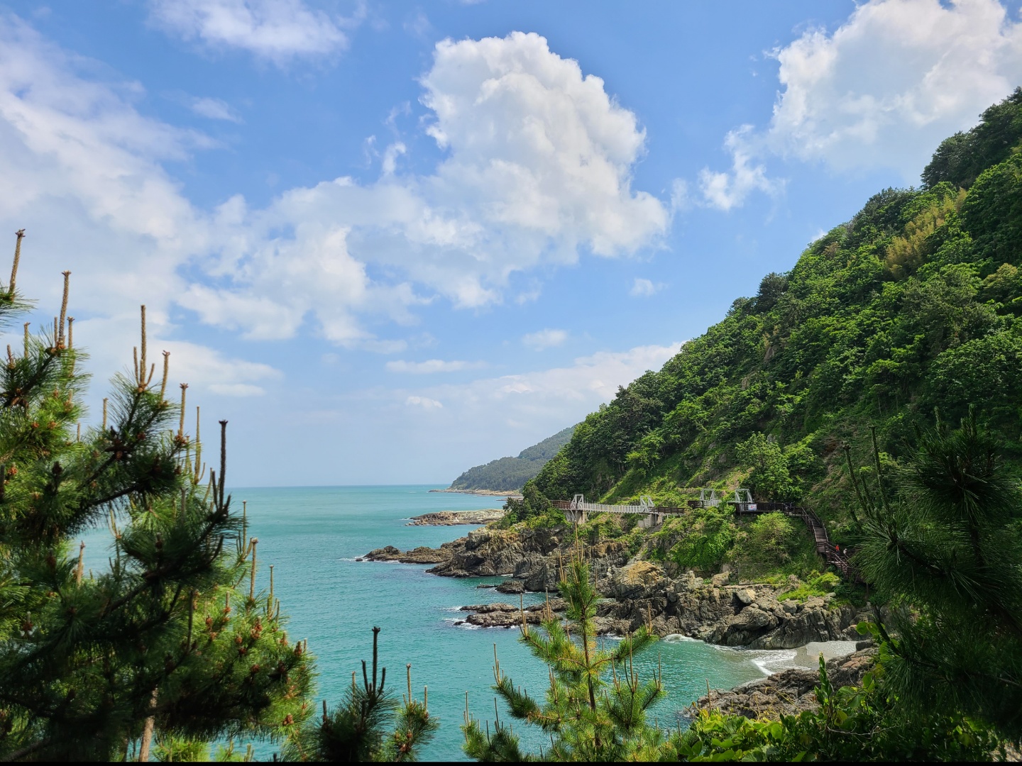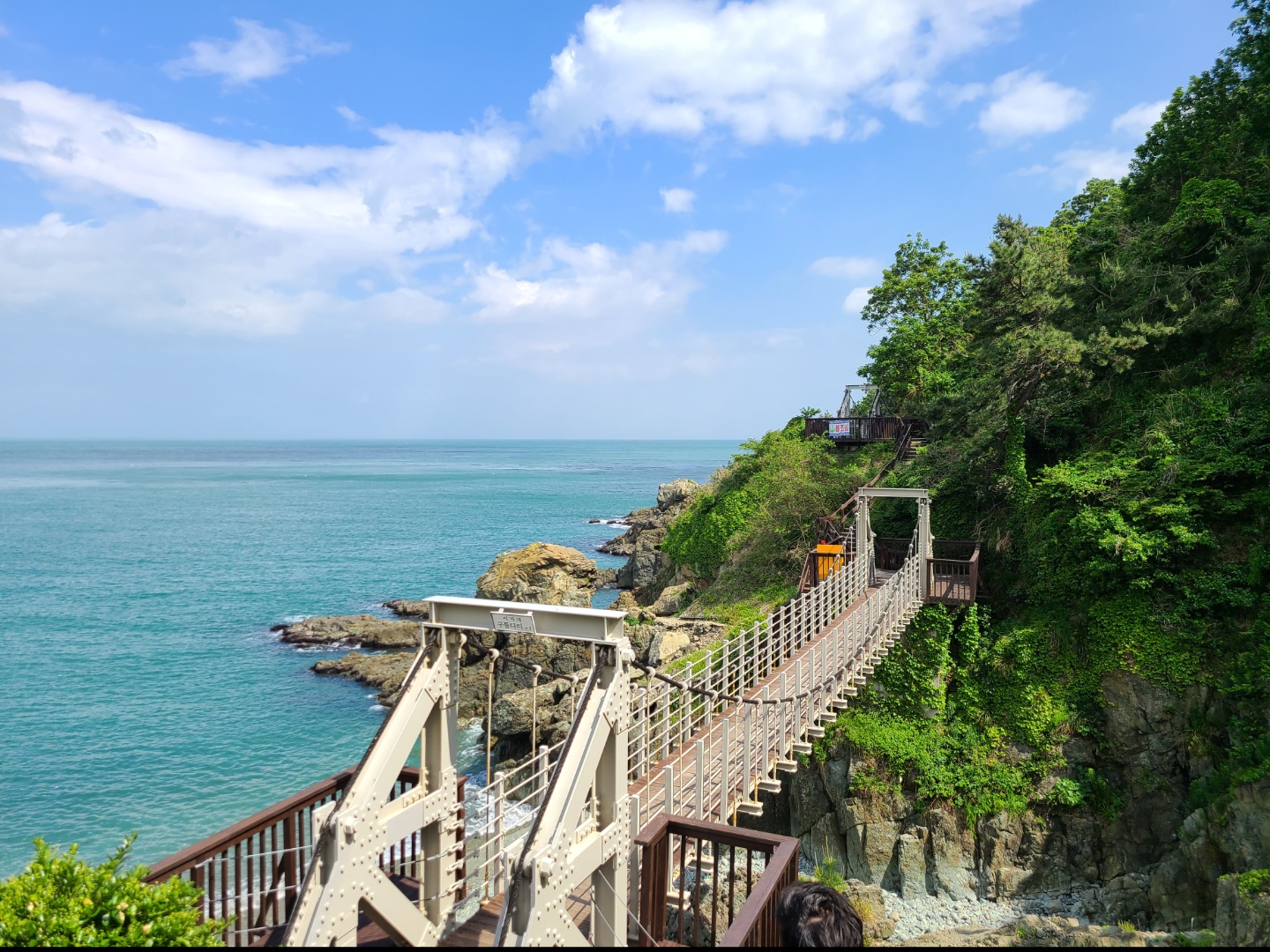 A coastal walking trail connecting Oryukdo Skywalk with Igidae Park offers stunning views of the sea and the city of Busan. Built along the sharp cliffs above the ocean, the approximately 4 kilometer-long trail features various sections, including a cloud bridge, wooden deck, stone pathway, and trails through the forest.